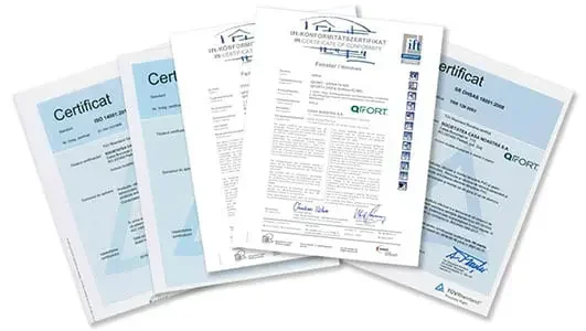 QFORT products are certified in terms of quality by ISO 9001:2015, ISO 14001:2015 and ISO 45001:2018 standards. In addition, QFORT holds compliance certificates issued by the ift Rosenheim Institute in Germany.
