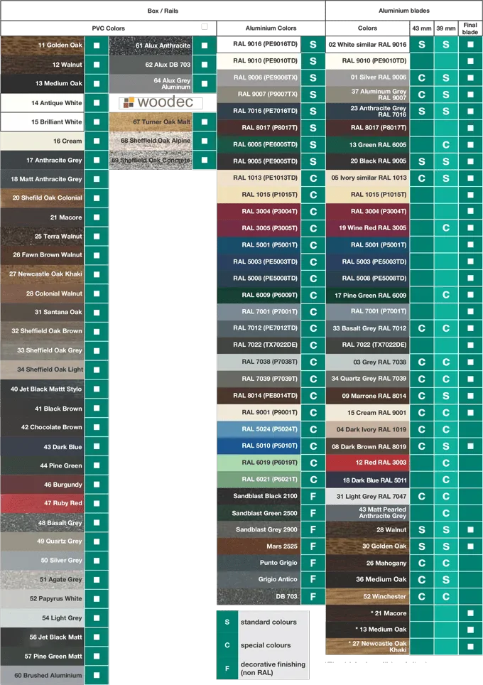 For choosing the colors, please check the PVC color chart. For the blades it can be checked the color chart of the Roller Shutter Blades.