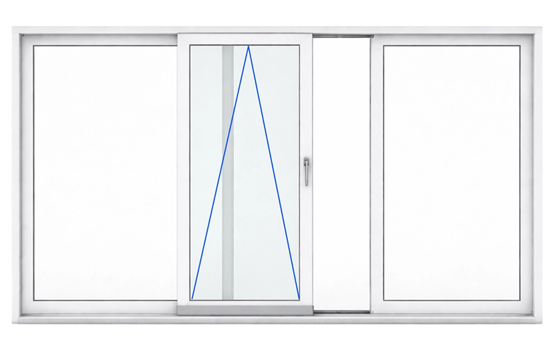 Structure panoramique avec 2 latéraux fixes et un vantail central mobile et batant.